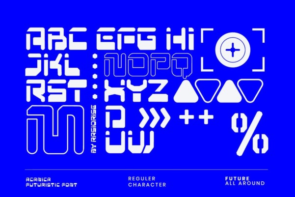 Acanica Futuristic Y2K Font Display by Rasiorise Studio. The Acanica font is now available for people looking for a futuristic font for the year 2000. Sci-fi, Cyberpunk, Hyperbeast, and Mecha font styles served as inspiration for this design. Some elements, such as regular and single-line typefaces, were combined to give the font a bolder appearance