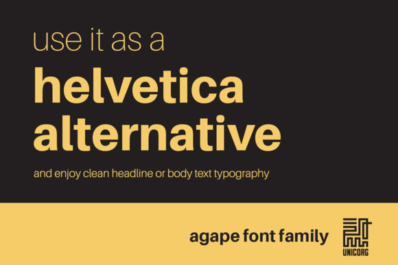 Agape is a sans-serif, neo-grotesque Helvetica alternative. INCLUDES LIGATURES & SUPPORT FOR GERMAN/SCANDINAVIAN CHARACTERS It is available in 8 weight variations, from Black to UltraLight.
