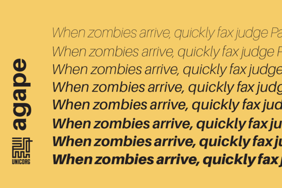 Also all weights are available in Italic too. Total of 16 different fonts. The font family is most suitable for headlines of all sizes, as well as for text blocks that come in both maximum and minimum variations. Agape font styles are applicable for any type of graphic design in web, print, motion graphics etc and perfect for t-shirts and other items like posters, logos. The package contains following fonts in Desktop and WebFont formats (.ttf .svg .eot .woff): Available Weights