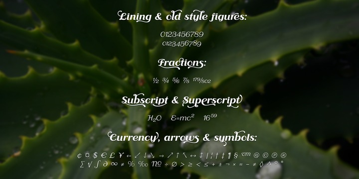 Each weight has over 900 glyphs including advanced typographic features, such as vast number of stylistic alternates, swashes, titling and terminal forms, case sensitive forms, ligatures, symbols, ornaments as well as lining and old style figures, fractions, subscripts and superscripts.