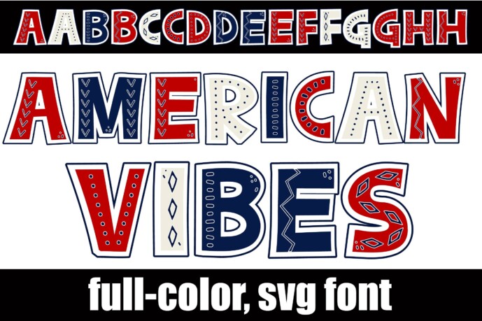 This full-color font features a chunky sans serif filled with whimsical patterns in an American color palette. There is an alt case of alternate colorings of each letter that you can access through your system or Silhouette’s glyph map.