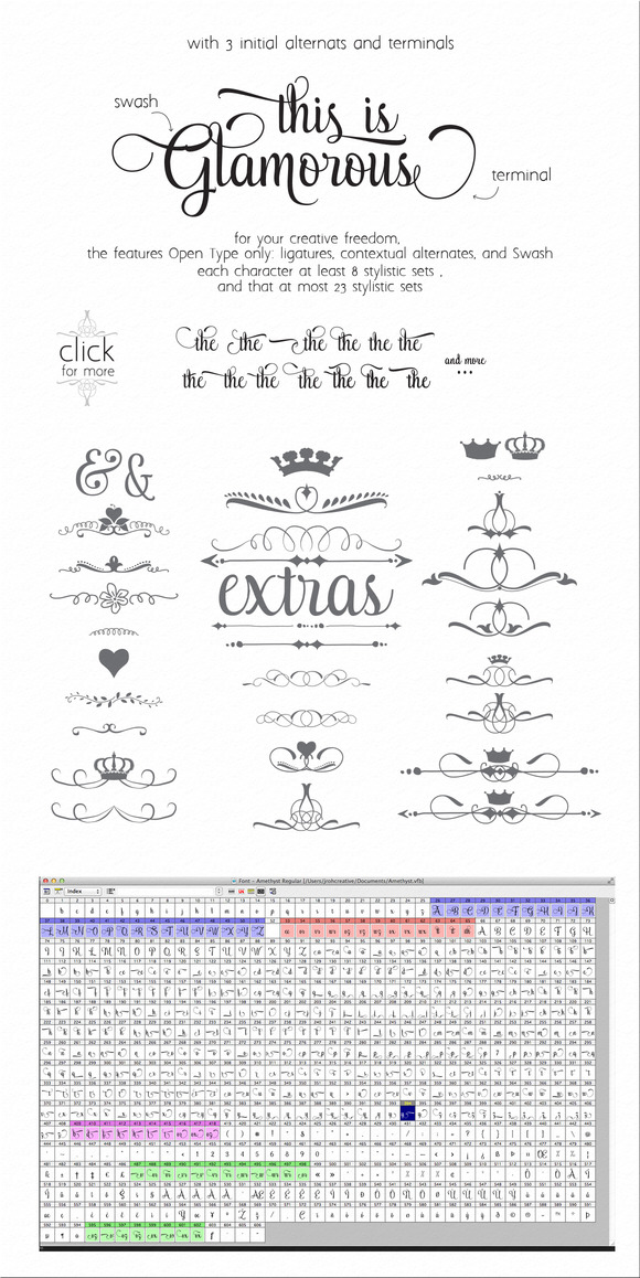 Amethyst come complete with 606 glyphs. This includes Uppercaps, Smallcaps, Numerals, Fractions, Punctuations, and most other Glyphs is a variation which is parts of the OpenType features such as;