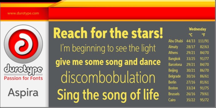 Aspira Font Family is a multi-purpose typeface. It is suitable for both text and display use — for graphic design, corporate identity design, magazines, newspapers, books, reports, advertising, signage, etc.