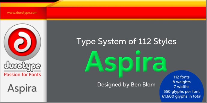 Aspira is a versatile typeface. It offers 112 styles consisting of 8 weights and 7 widths. It offers 56 upright fonts and 56 italic fonts. It offers lining and oldstyle figures (proportional and tabular). It offers small caps, ligatures, arbitrary fractions, and extensive language support.