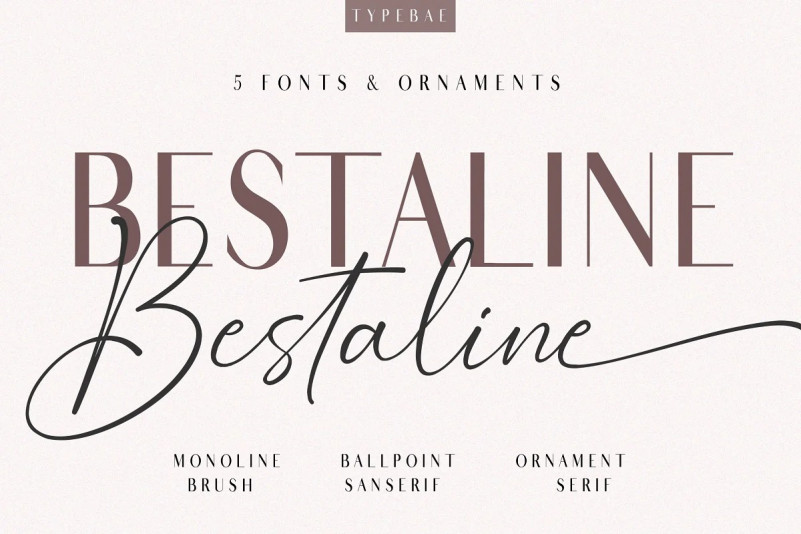Bestaline is a versatile font pack. It has 5 styles of fonts and ornaments, can be used and combined for various projects.