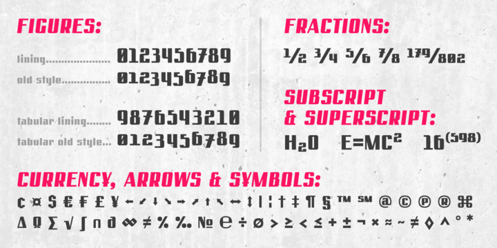 and tabular figures, fractions, ordinals, subscript and superscript, arrows, symbols and special characters.