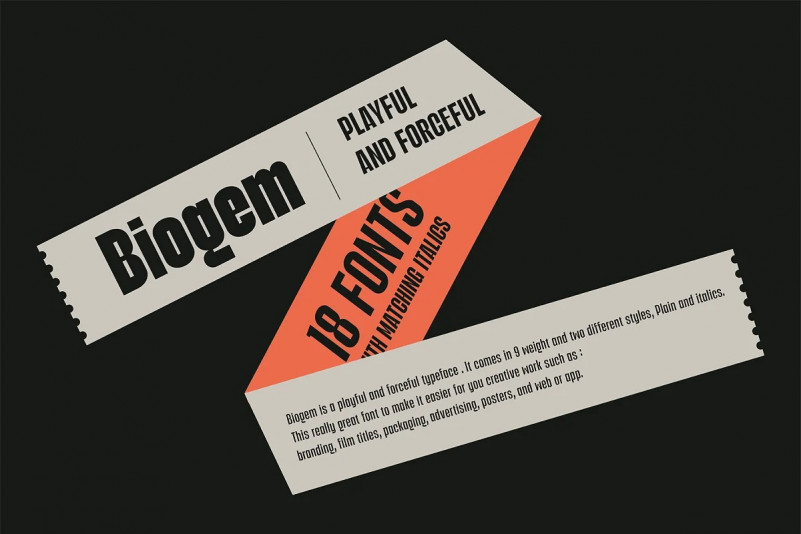 Biogem is a playful and forceful typeface . Containing 18 fonts that include both Plain and Italic styles, Biogem has 9 weights ranging from Thin to Black.