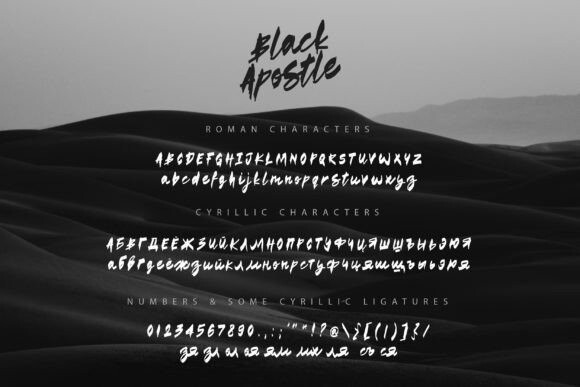 Black Apostle Font is a hand drawn brush font. It comes with uppercase and lowercase characters, set of punctuation glyphs, numerals, Cyrillic characters, some Cyrillic ligatures and multilingual support. It is perfect for logos, quotes, posters, branding projects, product packaging, t-shirt, book cover, greeting cards and applicable for any graphic design.