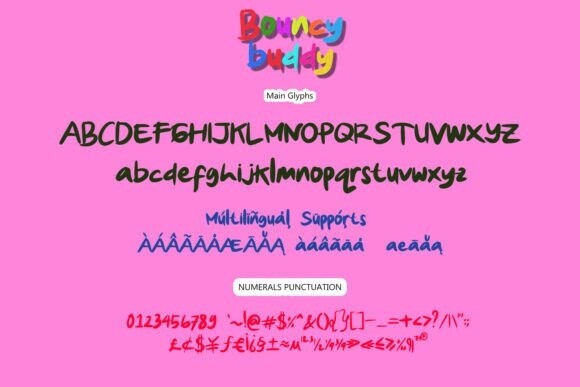 Bouncy Buddy Font is a fun, playful display font designed to bring joy and energy to any project. With its bouncy curves and friendly, rounded shapes, this font is perfect for children’s books, party invitations, playful branding, and more! Its lighthearted, whimsical style makes it ideal for anything that needs a dose of cheerfulness and personality. Whether you’re creating designs for kids, crafting vibrant advertisements, or adding a touch of fun to your social media posts, Bouncy Buddy is the perfect typeface to help your message stand out with charm and excitement.