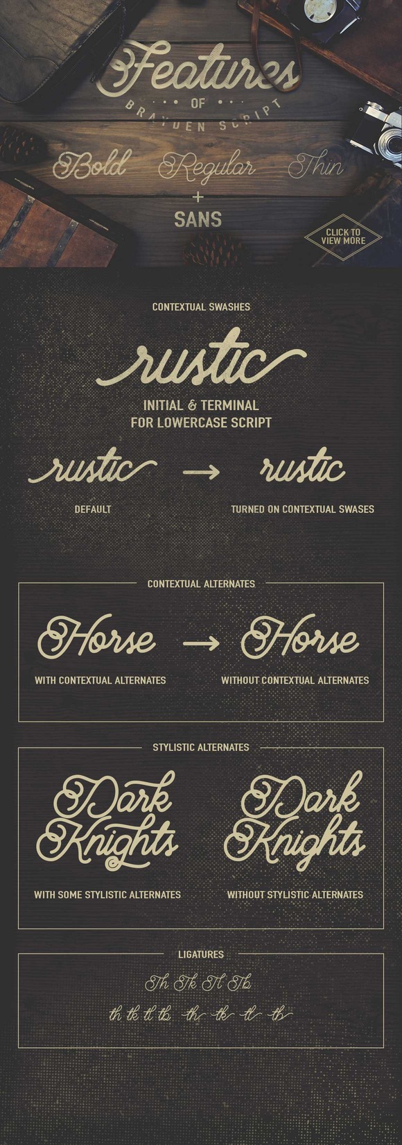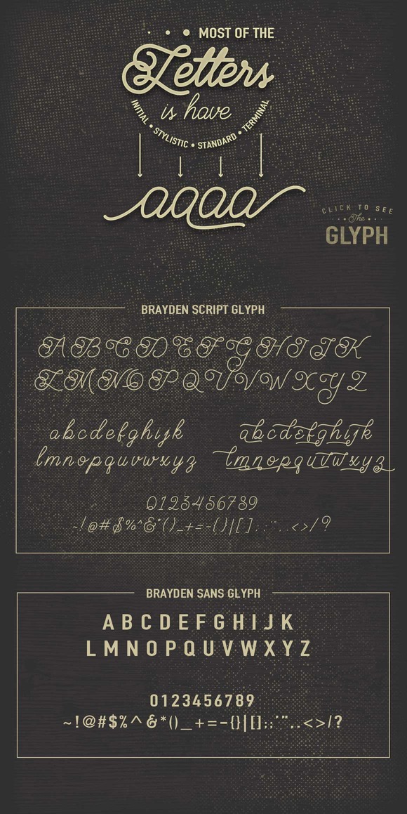Brayden Family is Family font that include 3 weight on script fonts + 1 Sans serif fonts to create the beautiful combination.Like my product before Octavia Script , I include them with initial and terminal forms in the all weght of script font. Controlling with Contextual Swashes made it easier to change turning on and off the initial and terminal forms. This Fonts is Great for Logos, Lettering, Clothing Design, Poster, Label, Quotes, etc.