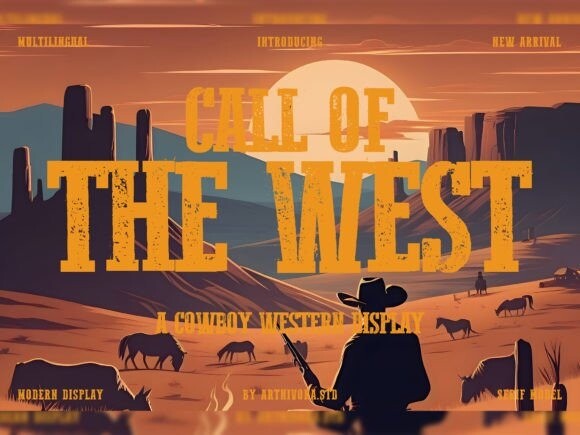 Call of the West Font, a cowboy western display font. This font captures the spirit of the frontier with bold, rustic letters that echo the untamed landscapes of the Old West. Perfect for adding a touch of cowboy flair to your designs, “Call of the West” is ideal for posters, signage, or any project that calls for a dash of Western authenticity. Saddle up and let your creativity ride the trails of the frontier with this bold and adventurous typeface.