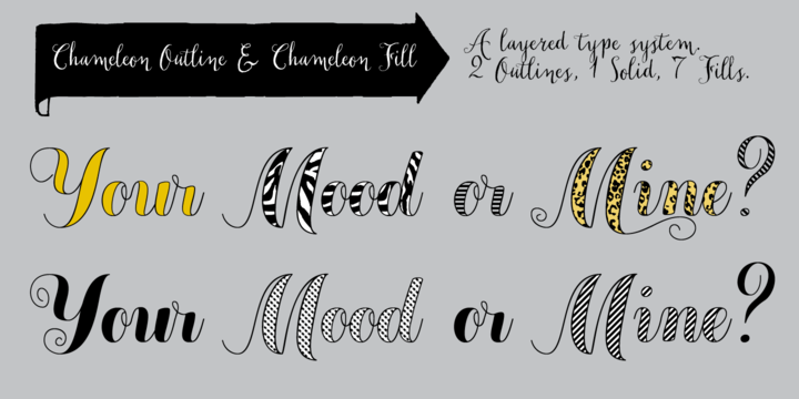Chameleon comes in three styles: 2 outline versions and a basic (solid) version. To combine Chameleon with Chameleon Fill, you will need an application that allows you to stack text frames. Once you start layering different fills, like a true chameleon, you can change colors and patterns. Simply place several layers on top of each other, choose from 7 fills to determine your pattern and assign a color to the fill. Always place one of the outline versions of Chameleon on the top layer.
