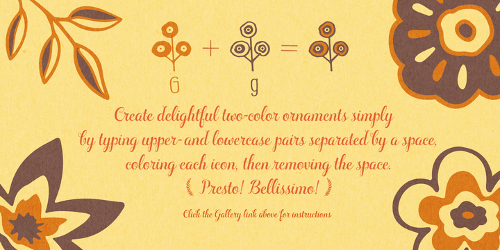 What’s truly innovative about Ciao Bella’s ornaments is that many of the drawings come in pairs that can be set in multiple colors without any stacking, layering, or aligning. They work in any application that supports kerning — even most word processors. See the Gallery link above for details.