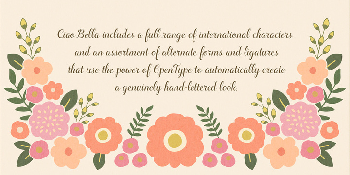 The Ciao Bella script’s full range of international characters and alternates use of the power of OpenType to automatically create a genuinely hand-lettered look.