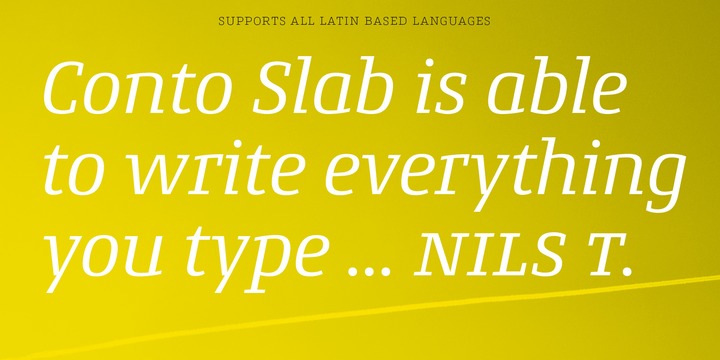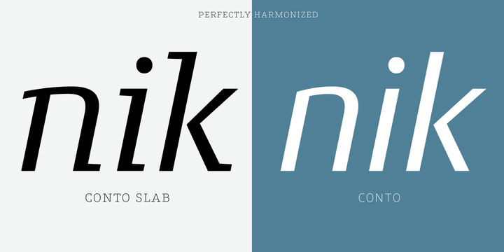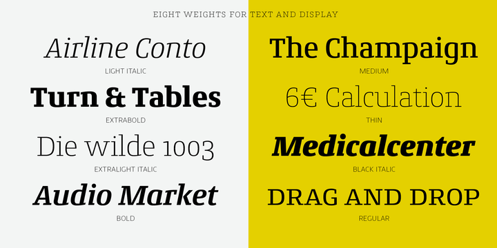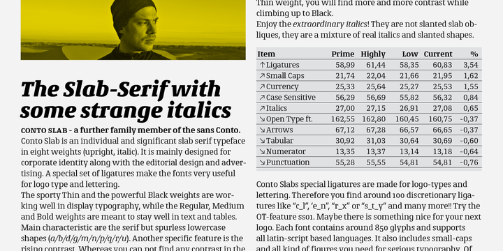 Conto Slab – a further family member of the sans serif Conto. Conto Slab is an individual and significant slab serif typeface in eight weights (upright, italic).
