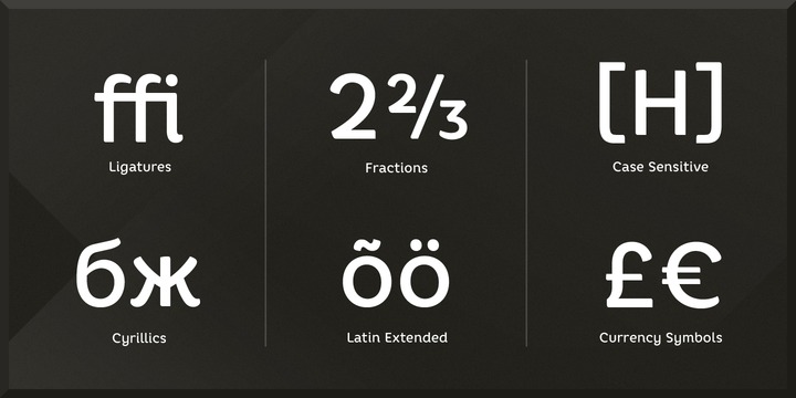 The OpenType fonts contain complete Latin 1252, Cyrillic, Central European 1250, Turkish 1254 character sets. Each font includes proportional figures, tabular figures, numerators, denominators, superscript, scientific inferiors, subscript, fractions.