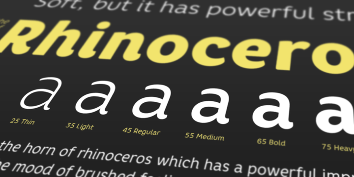 The Core Rhino family consists of 7weights (Thin, Extra Light, Light, Regular, Bold, Heavy, Black) plus matching italics.