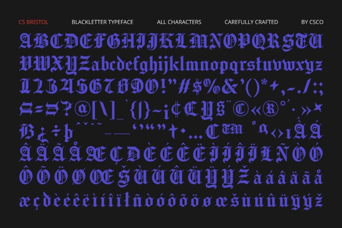 Ornate and Bold Design Characterized by its intricate details and commanding presence, CS Bristol’s design reflects the prestige and tradition of historical Blackletter typography. Its ornate and bold letterforms make it ideal for projects that require a touch of sophistication and formality.