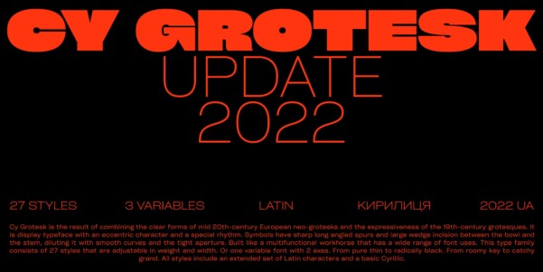 Cy Grotesk Font Family is the result of combining the clear forms of mid 20th-century European neo-grotesks and the expressiveness of the 19th-century grotesques. It is display typeface with an eccentric character and a special rhythm. Symbols have sharp long angled spurs and large wedge incision between the bowl and the stem, diluting it with smooth curves and the tight aperture. Built like a multifunctional workhorse that has a wide range of font uses. This type family consists of 27 styles that are adjustable in weight and width. Or one variable font with 2 axes. From pure thin to radically black. From roomy key to catchy grand. All styles include an extended set of Latin characters and a basic Cyrillic.
