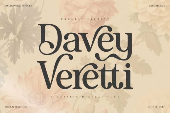 Davey Veretti Font is a classic serif display font. It features elegant, sharp edges and traditional letterforms, making it perfect for headlines, logos, and titles. The font gives a timeless and sophisticated look to any design.