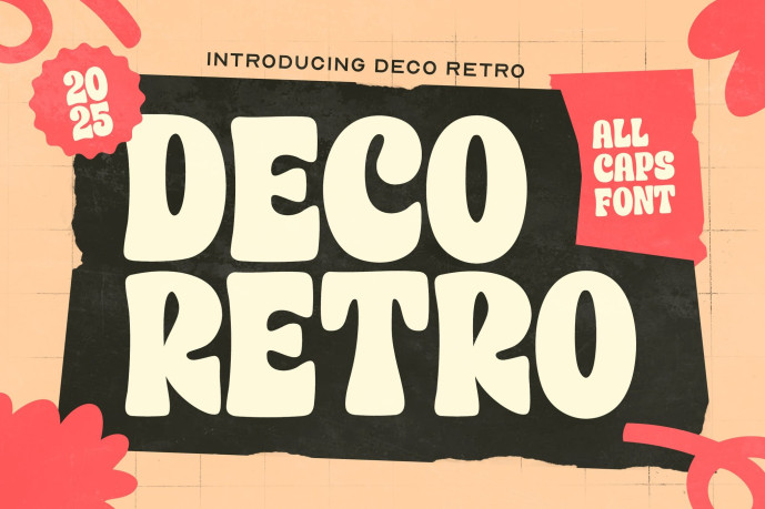 Deco Retro Font is a groovy all caps display font inspired by 60s–70s poster lettering and nostalgic packaging. The rounded, chunky shapes and soft curves give every word a friendly, bubbly feel while still looking bold and eye-catching. This font is perfect for retro-themed branding, music posters, food and beverage packaging, social media graphics, and any design that needs a warm vintage vibe. Use Deco Retro for big titles, logo lockups, and colorful layouts to instantly transport your project into a fun throwback era. Deco Retro includes uppercase letters, numbers, and punctuation, making it easy to create complete compositions for both print and digital work.