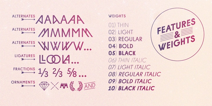 The Diamonds type family is equipped for complex, professional typography. The OpenType fonts have an extended character set to support Central and Eastern European as well as Western European languages. Each font includes alternate letters, fractions, scientific superior/inferior figures and a set of arrows and geometric forms.