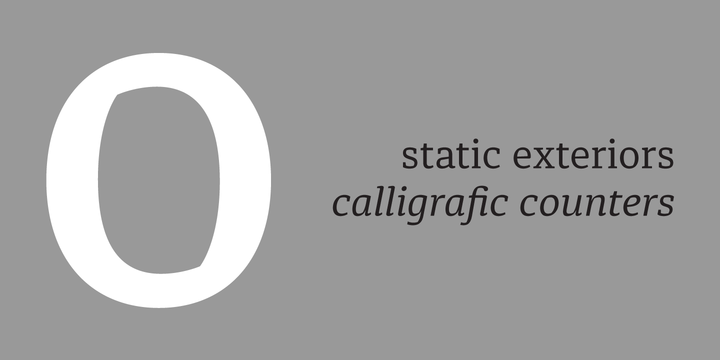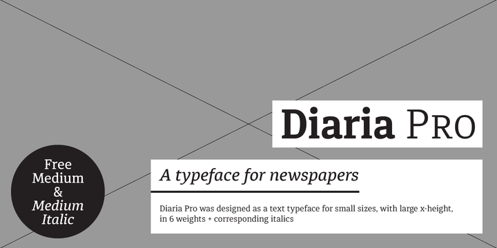Diaria Pro is a low-contrast serif typeface designed as a primary text face for the newspapers. Its large x-height and static exteriors allow comfortable reading in narrow columns, and calligrafic counters as well as dynamic serifs add humanist detail to overall perception and incline contrast axis without affecting interletter counterforms.