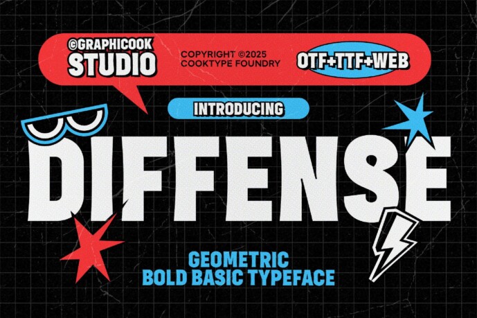 Diflense is a sans-serif font featuring bold letterforms and a cartoon-inspired style that adds a playful touch. It’s ideal for comic books, children’s books, toy packaging, or event branding.