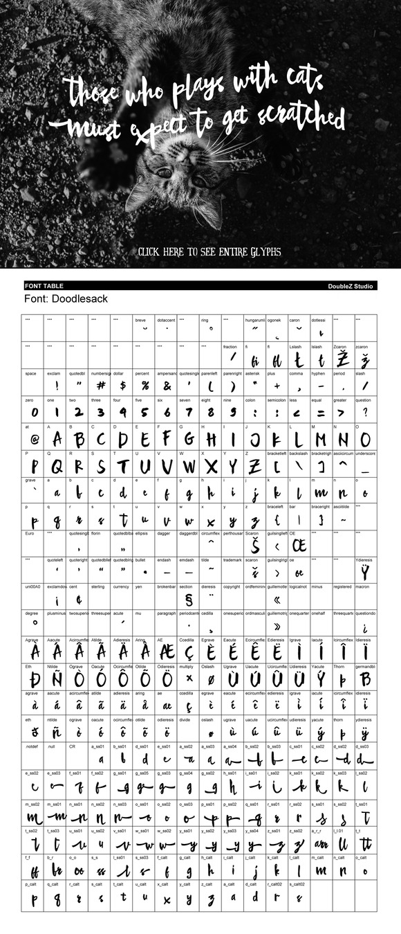 Doodlesack is a beautiful script in flaws. Spontaneous, wild hand and imperfect flow give the natural looks. Great for designing book covers, film covers, apparel, cards, logos, posters, etc. Opentype features gives you more alternatives in designing.