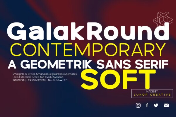 Galak Round Font is a modern geometric sans serif family characterized by its simplicity and extensive functionality.consisting of 9 weights ranging from Hairline to Heavy with matching italics. It supports Extended Latin, Cyrillic and Greek. This blend produces a typeface of modern, clean and contemporary appearance that has implicit on its core a classic vibe, nourishing the text with a timeless elegance. In use, the form and function balance of its design allow it freely travel through a diverse range of fields and possibilities like short text settings, brands, headlines or signage systems with grace and naturality.