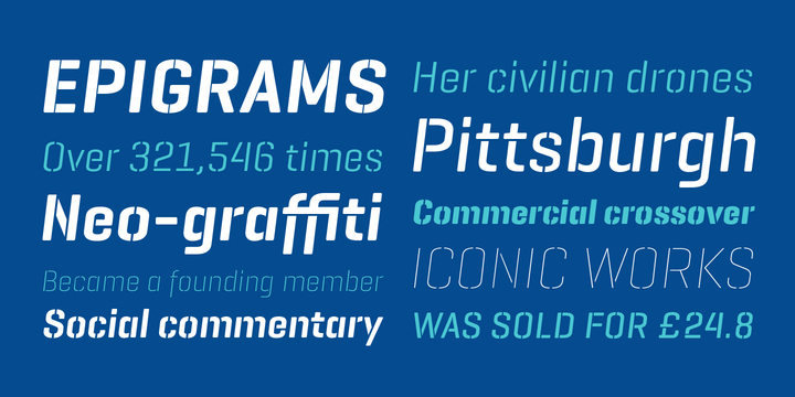 These cuts not only allow a better performance when printing at different sizes, you can also move across versions A, B or C in accordance to the rigidity of the material used. The family consists of 21 styles, 7 weights with 3 versions each, all of them in Open Type format with support for Central and Eastern European languages. Furthermore, the combination of both Geogrotesque Stencil families, upright and italic, gives way to a superfamily up to 42 styles. For a non stencil version please see Geogrotesque Family.