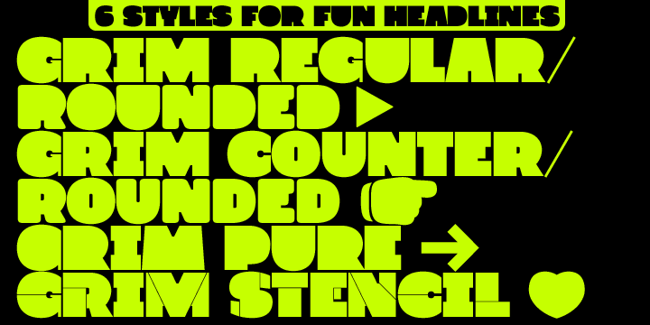 Grim is a display family with a lot of room for application, most obvious being the tightly fitted headlines with impact. It works especially well as a counterpart to a serious, refined serif font.