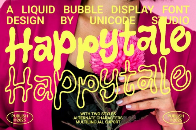 Happytale Display Font is a playful liquid bubble display font that brings fun and creativity to your designs. Its bold, rounded shapes and flowing curves make it perfect for cheerful projects, children’s themes, branding, packaging, posters, and eye-catching headlines.