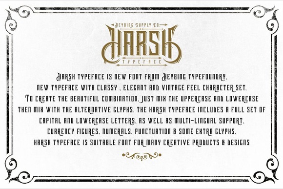 Harsh typeface is new font from Heybing Supply Co, new typeface with classy, elegant and vintage feel character set. To create the beautiful combination, just mix the uppercase and lowercase then mix with the alternative glyphs. The harsh typeface includes a full set of capital and lowercase letters, as well as multi-lingual support, currency figures, numerals, punctuation & some extra glyphs. Bundling with vector, catchword, and badges design as a bonus.