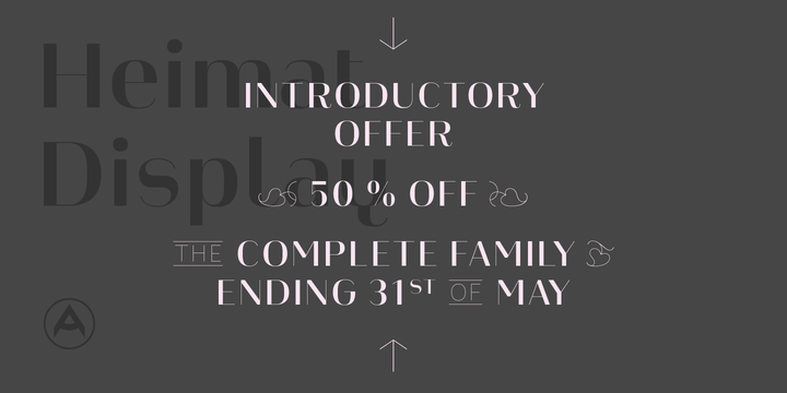 Heimat Display is the high contrast sans serif typeface family within the Heimat Collection, also containing Heimat Didone, Heimat Sans, Heimat Mono and Heimat Stencil.