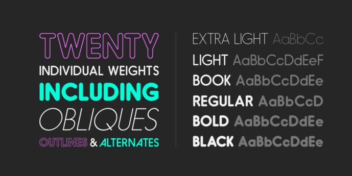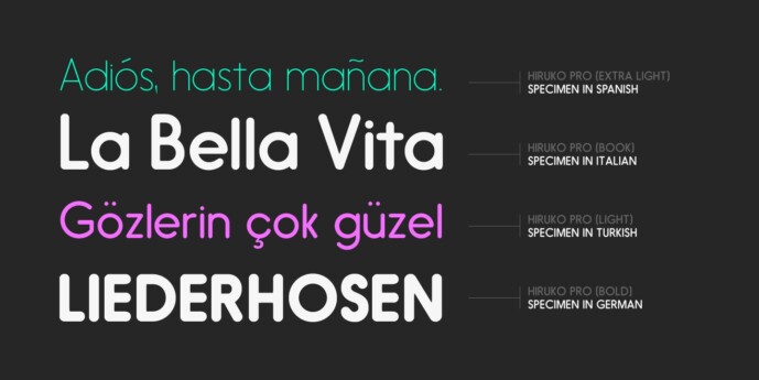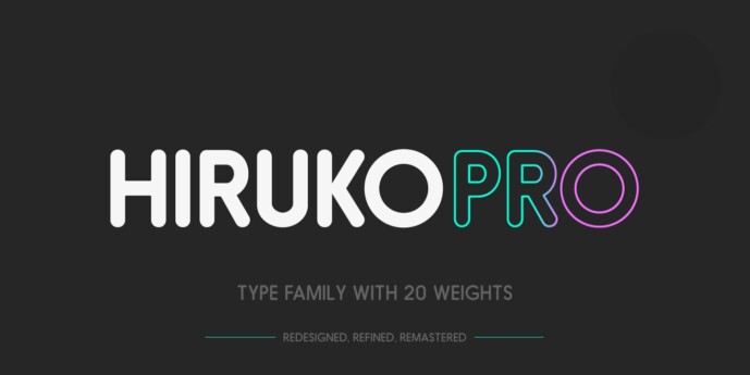 Hiruko Pro Font Family is a modern and legible font cleverly combining smooth lines and playful curves. It’s a complete revamp of the original 2008 Hiruko family. With its softened edges, it emits a family friendly, kids welcome vibe and is easily legible in any situation. With a full family of 21 weights, varying from bold and attention-grabbing, to slick and smart outlines, to extra light and delicate, Hiruko Pro has a tonne of applications, and we still come across new ones.