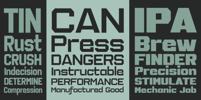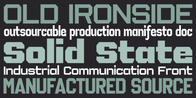 The IronOn fonts are a collection of geometric display faces that were inspired by the iron-on t-shirt lettering of the 70s. The original source came from a submitted sample to the MyFonts “What the Font” forums, and while it had similarities to ITC Machine, it could not be tied to any existing typeface. And so, this new geometric sans family was born, exhibiting a more open letterstyle with several weights and widths, with a complete capital and lowercase set, no allcaps set here. Ideal for packaging, T-shirts, advertising, or for industrial applications like signage and newsletter headlines, this powerhouse font family offers a unique rigid flexibility.