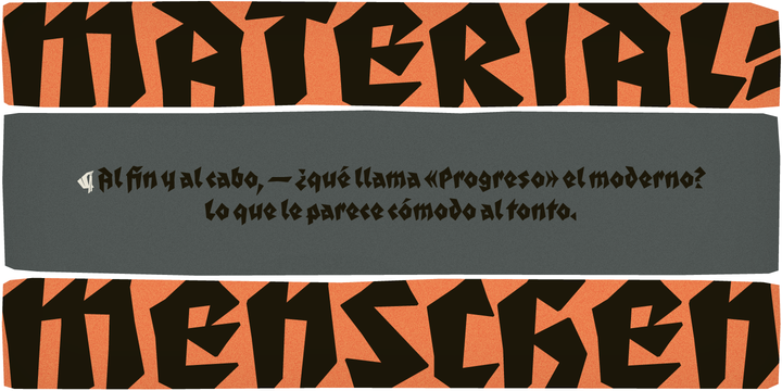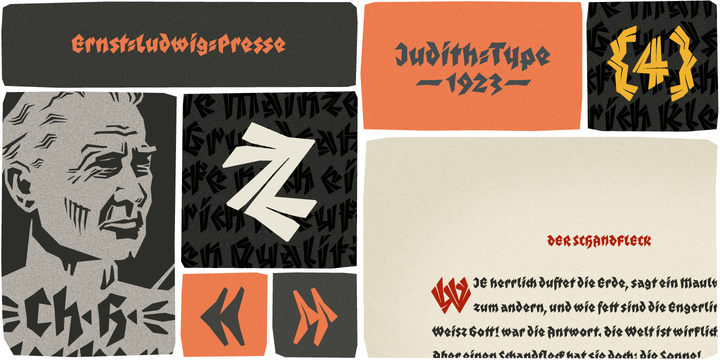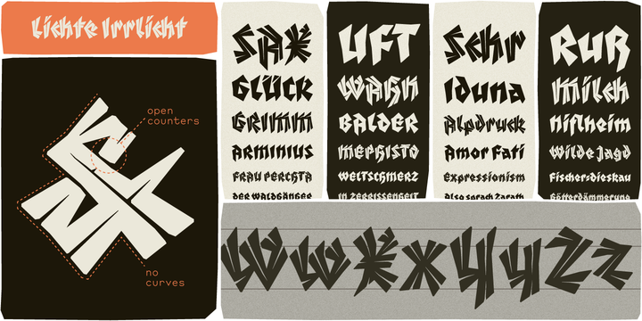 Irrlicht is based on C. H. Kleukens’ 1923 typeface Judith Type. Whilst Dunkle Irrlicht is a fairly faithful rendition and extension of Kleukens’ typeface, the Licht style was initially