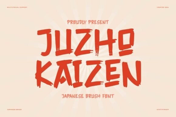 Juzho Kaizen Font is a Japanese brush font that looks like it was painted with a traditional brush. The letters have a smooth, flowing style with bold strokes, giving it an artistic and authentic feel. This font is great for adding a touch of Japanese culture to designs, making them look elegant and expressive.