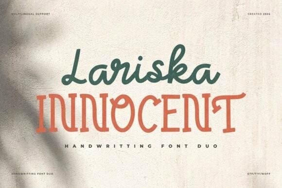 Lariska Innocent Font is a playful and elegant font duo that combines two handwriting styles. One is more delicate and pretty, while the other is bold and casual. Together, they create a balanced and stylish look, perfect for invitations, logos, and personal projects.