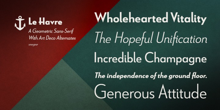 Le Havre is a geometric sans serif inspired by the golden era of the passenger ship, when getting to your destination was a delight in and of itself.