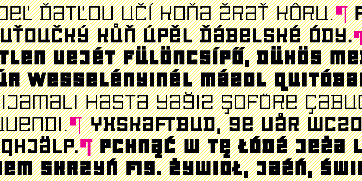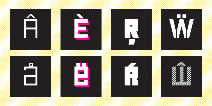 The font contains several specific styles as Stencil, Pixel, Tride, Shadow which combinations offer interesting possibilities for the typesetting. The metrics and kerning of every glyph of the font (except several glyphs in Bold) are identical. All the signs share the same character and size of the capital letters.