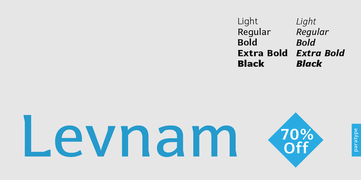 Levnam is a sans-serif family with quite wide proportions, slightly thickened terminals and wide sidebearings. The font is well suitable for setting text in small point sizes, similar to Bell Centennial or Verdana. Designed by Manvel Shmavonyan. Released by ParaType in 2015.