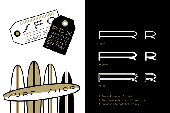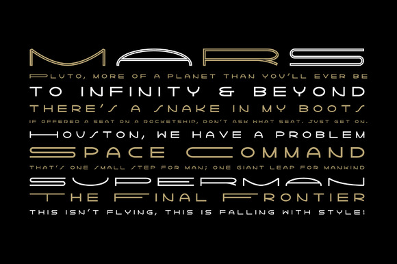 Lightyear is a retro typeface with roots in the 1950’s space science-fiction era. The combination of super extended capitals with the all-capped lowercase makes for a unique and interesting result. This typeface is also packed with a few alternate letterforms, 2 sets of arrows, and glyphs for various uses.Some of the more useful ones are: “ALT” + “S” = alternate uppercase S “SHIFT” + “ALT” + “S” = alternate lowercase S “ALT” + “&” = uppercase ampersand “ALT” + “1” = ” /100″ symbol