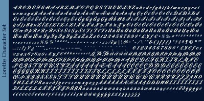 Lorette Font – A Vintage Script for Romance Novels. Lorette began as a digitization of a film typeface from LetterGraphics known as “Laurel”. The original specimen included standard Capitals, Lowercase, Numerals, and minimal punctuation, for a bare bones character set. We’ve fleshed out Lorette to include a full standard character set, an extended international set, Stylistic Alternates, Ligatures, Swash Capitals, etc. so it can be a powerhouse script typestyle. See the 5th graphic for a comprehensive character map preview. Opentype features include: – Full set of Inferiors and Superiors for limitless fractions. – Tabular, Proportional, and OldStyle figure sets. – A collection of Ligatures mainly revolving around the f character. – Discretionary Ligatures for ct and st combinations. – 3 Stylistic Alternates for variations of some of the lowercase characters. – a Swash feature for swash alternates of the Capital letters. Approx. 993 Character Glyph Set: Lorette comes with a glyphset that includes standard & punctuation, international language support, and additional features.
