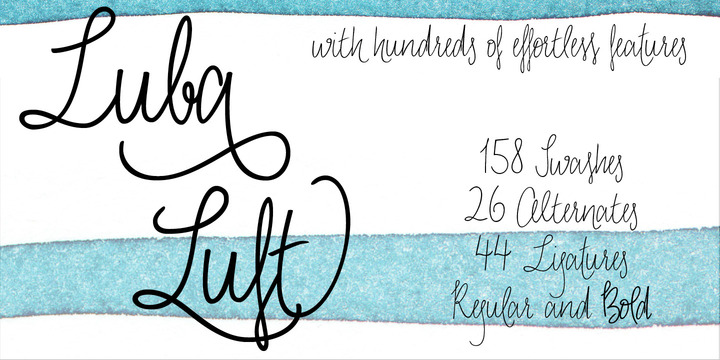 Luba Luft is a semi-connected script font that has an airy and casual look to it. Smooth letters with upright curves flow effortlessly over the page, the letterforms vary slightly to emphasize the light, flowing characteristics of the typeface. One of the unique features of Luba Luft are these subtle variations, letterforms flowing and curling around each other as if written by hand – contextual alternates.