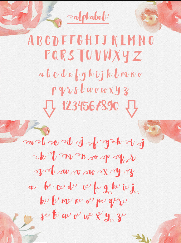 “Lussira Brush Script” was completely handwritten using watercolors and a calligraphy brush, a beautiful hand painted script that comes with a set of extras. Perfect for wedding invitations, adding design accents, and giving your projects a coveted hand-crafted look. I especially love the look of this font with watercolor textures added! This font covers all basic letters