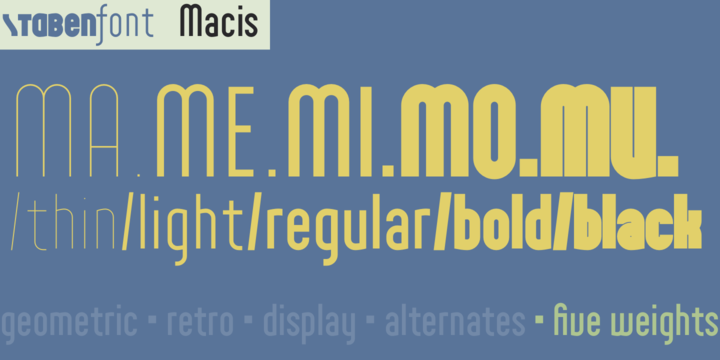 Macis is a real-and-fake-retro-modern font-family containing five weights from thin to black. It is inspired by shop signs, packaging and typography from around the middle of 20th century.
