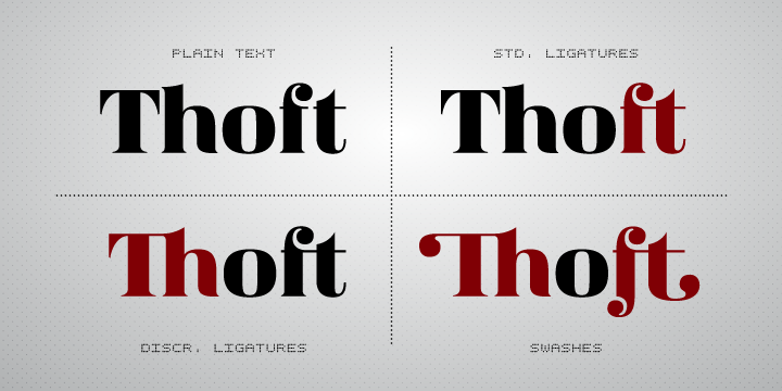 Other OT features include: lining/oldstyle numerals, ordinals, popular fractions, capital spacing, scientific superiors/inferiors.