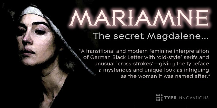 MARIAMNE is an original design by Alex Kaczun. It is an elegant, modern and traditional interpretation based on and modeled after his successful “Contax Pro” and “New Age Gothic” typeface series. As such, it has generous proportions with clean, crisp lines